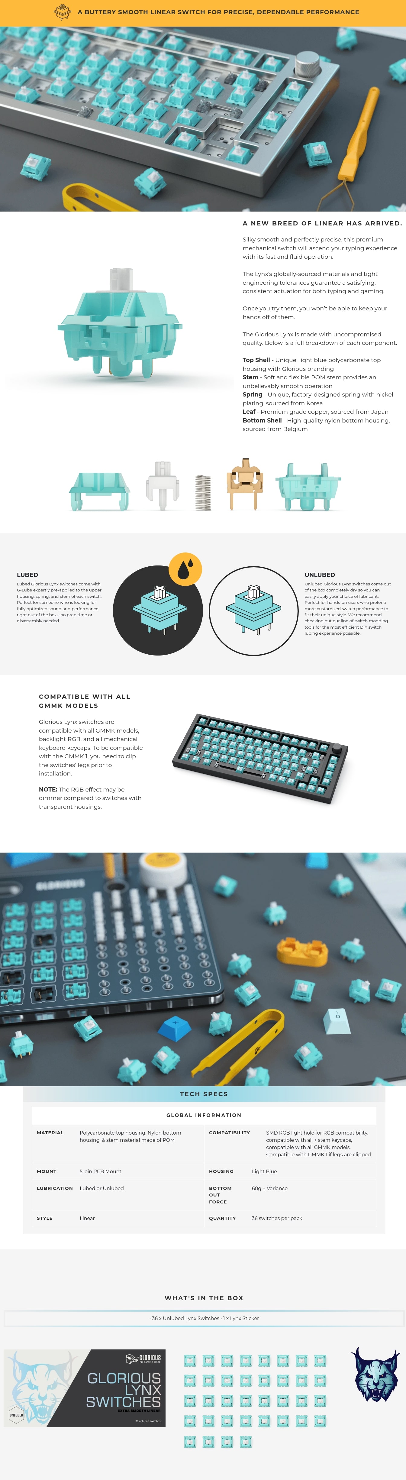 • Compatible with all “+” stem keycaps and GMMK models. To be compatible with the GMMK 1, you need to clip the switches’ legs before installation.
