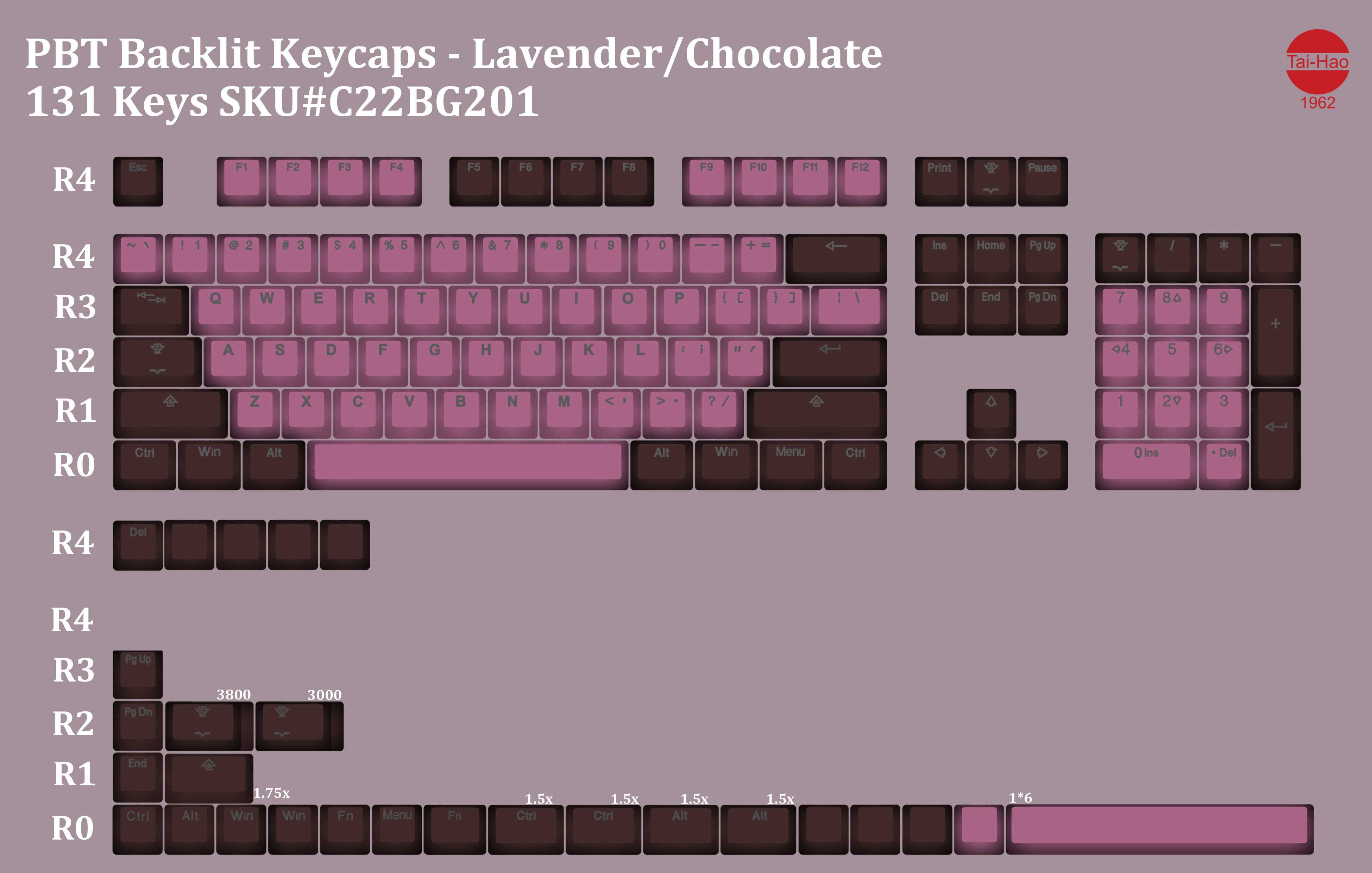 | Set Includes | 1.75u Shift, 6.25u Spacebar, 1.25u Alt, 1.25u Ctrl, 1.25u Win, 1.5u Alt, 1.5u Ctrl, 1u Alt, 1u Ctrl, 1u Fn, 1u Win, 2.25u Shift, 2.75u Shift |