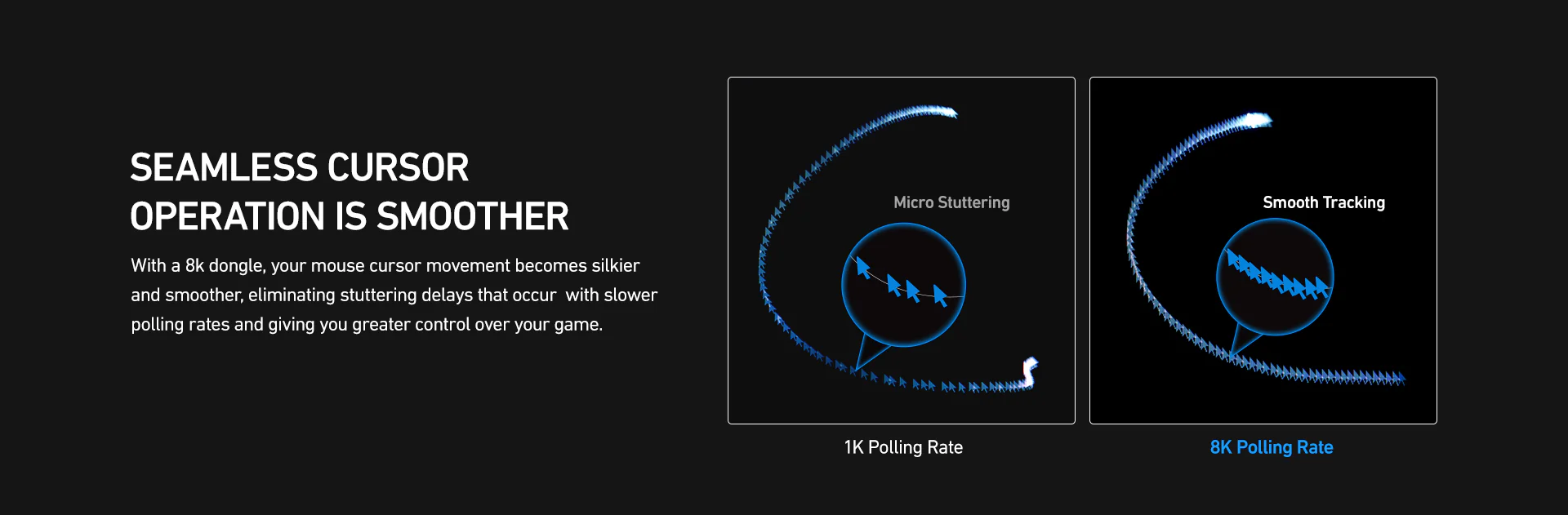 - 8K Hz represents a quadruple improvement versus the old 1k Hz mice.(sends 8 times more data to your PC).