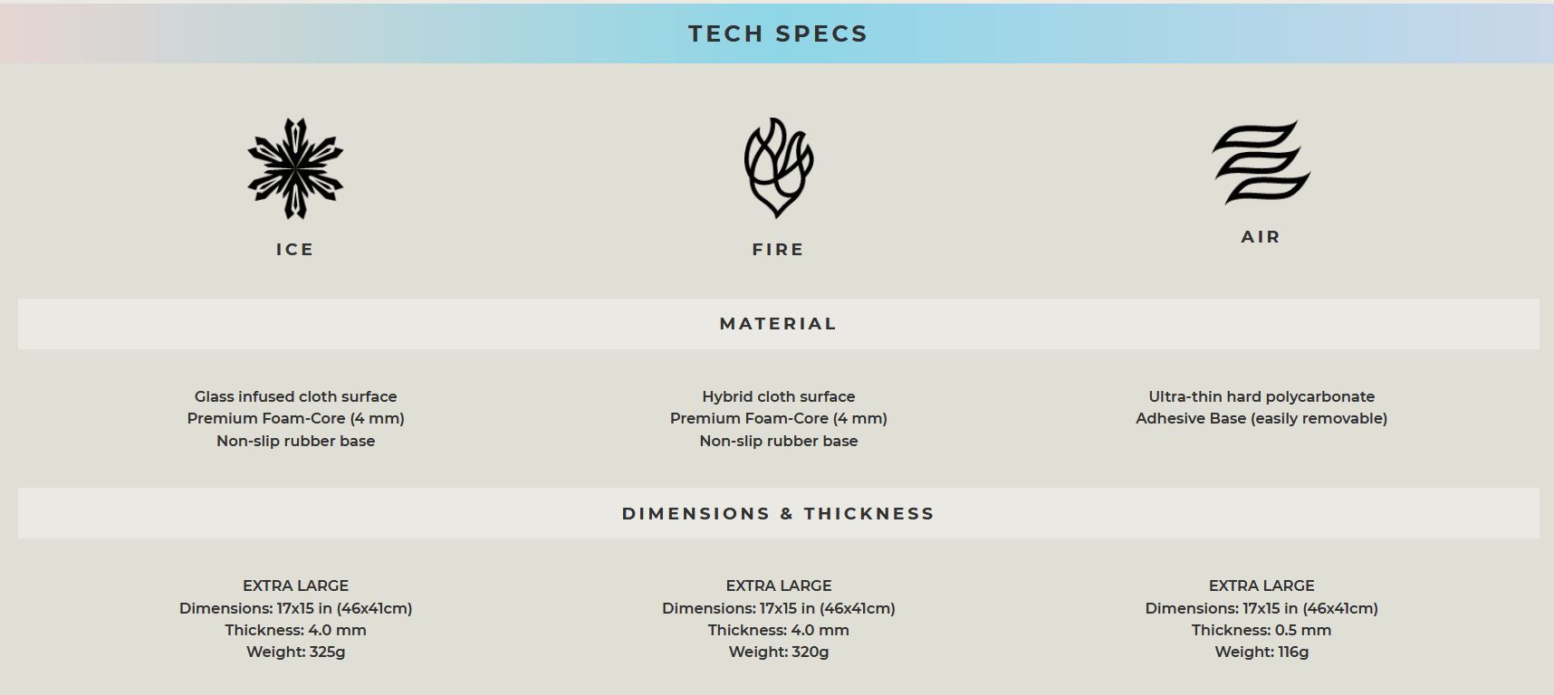 | Thickness | AIR: 0.5 mm, FIRE: 4 mm, ICE: 4 mm |