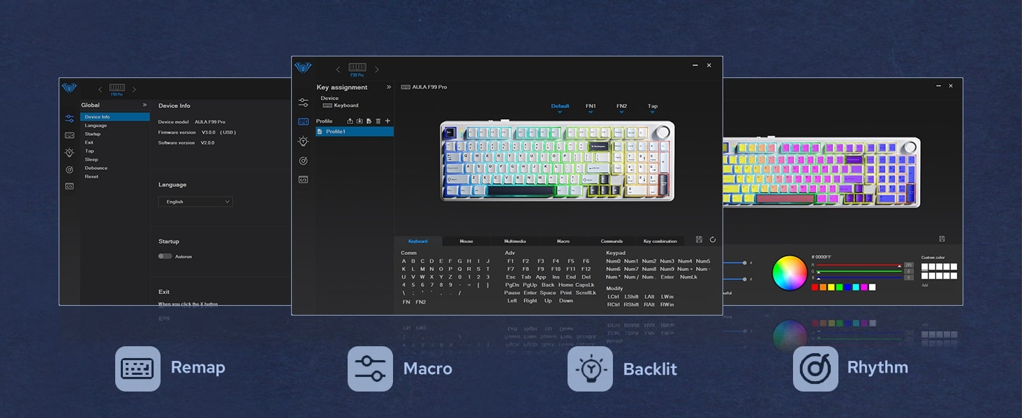 • F99 PRO with AULA Driver software, allowing you to personalize key settings, macros, and dynamic lighting effects.