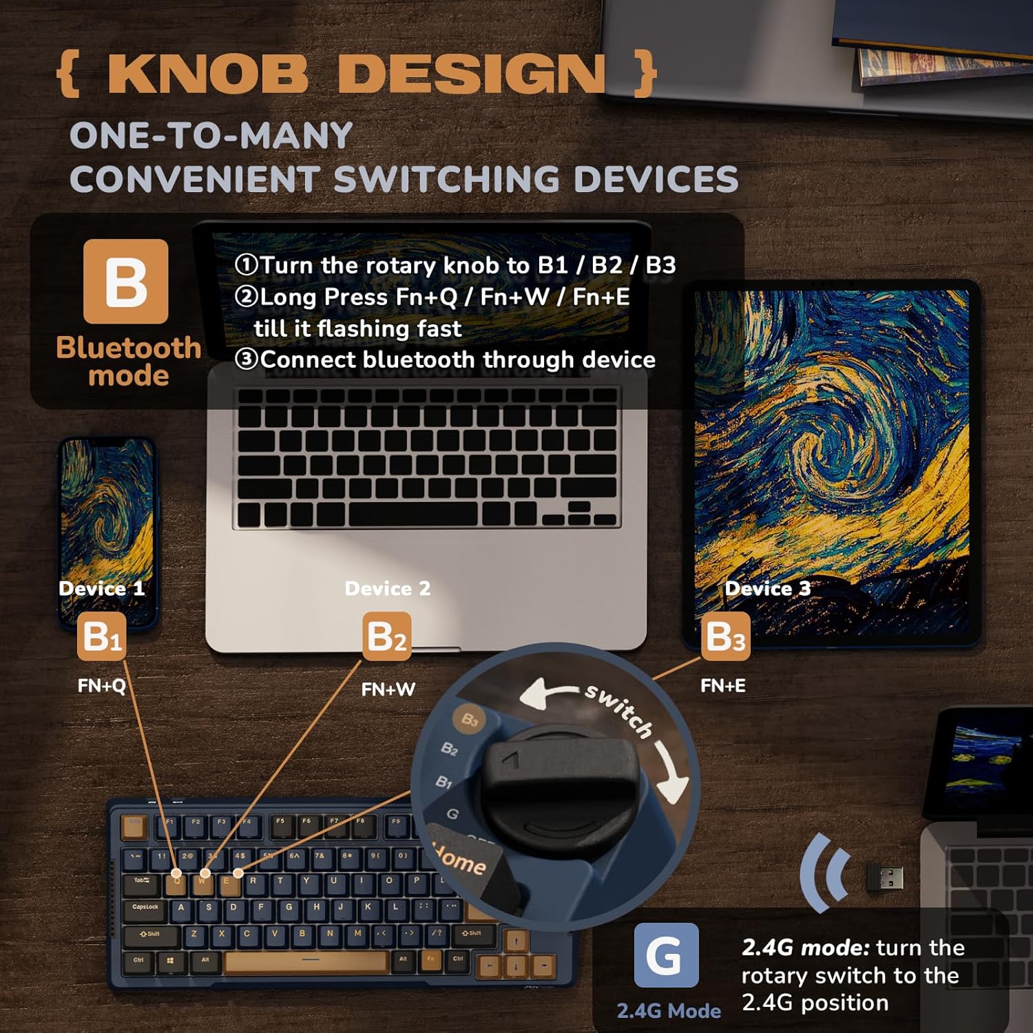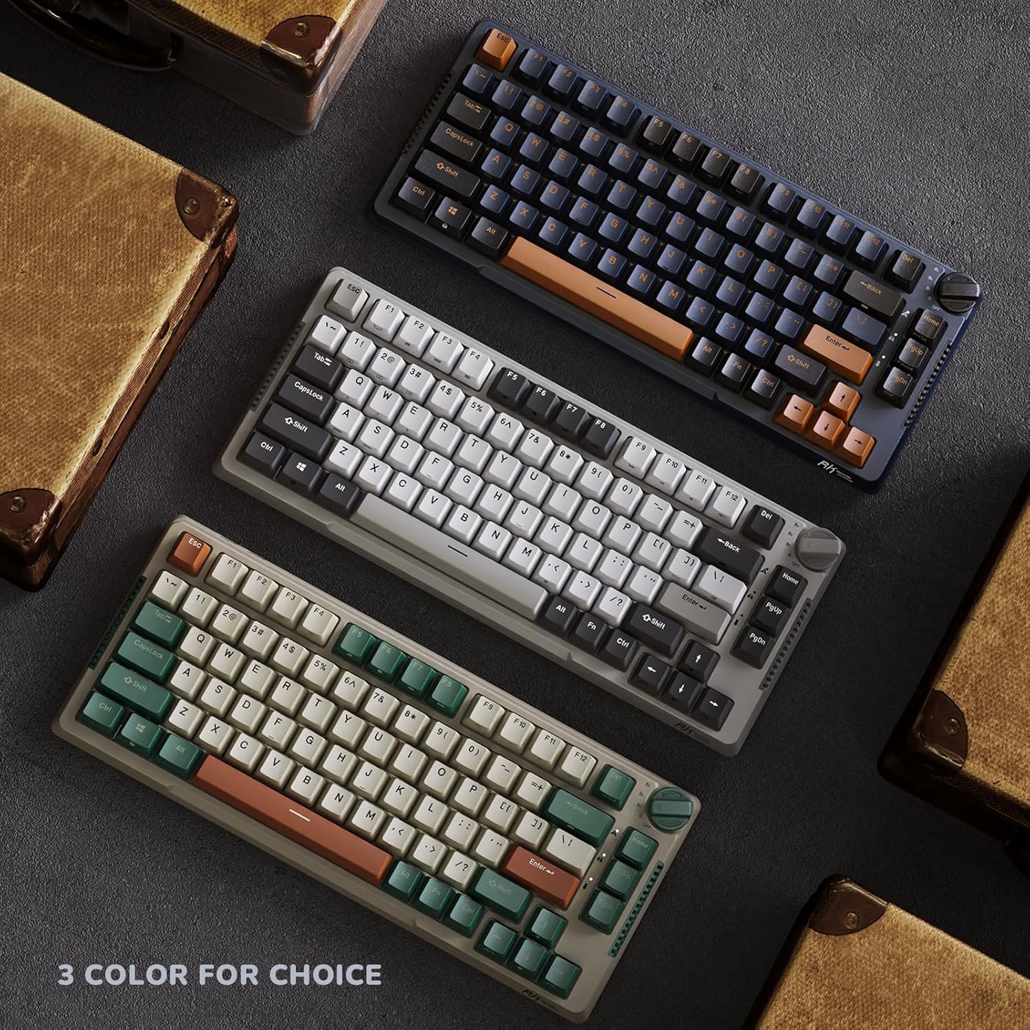 - RKH81, comes with a mode-switch knob & gasket design. and It can connect up to 3 devices via bluetooth at the same time and switch between them by knob easily.