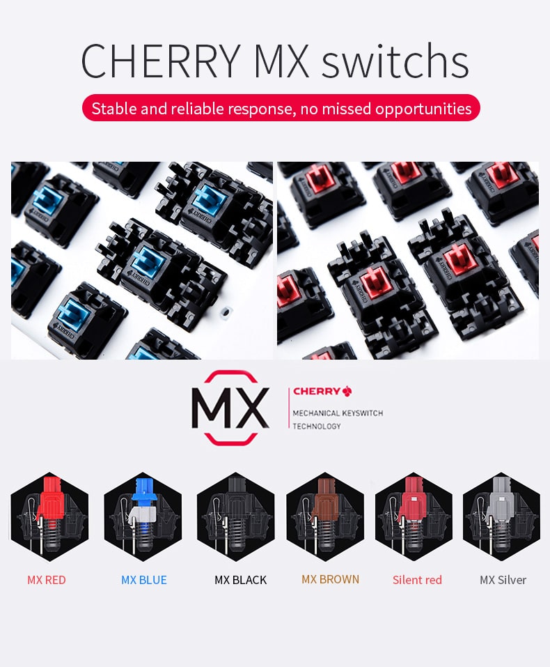 | Key Switches | Cherry MX Blue, Cherry MX Brown, Cherry MX Red |