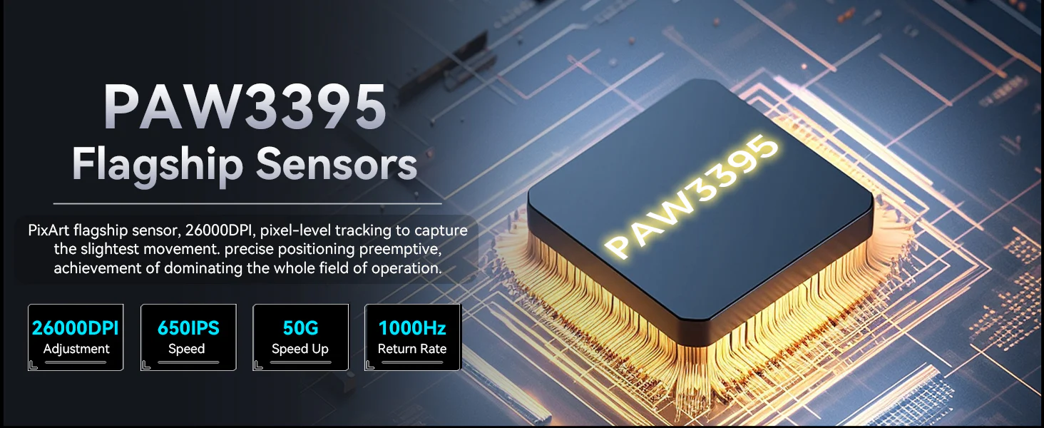 - Gaming mouse with 26,000 DPI (6 levels) and PixArt 3395 sensor.