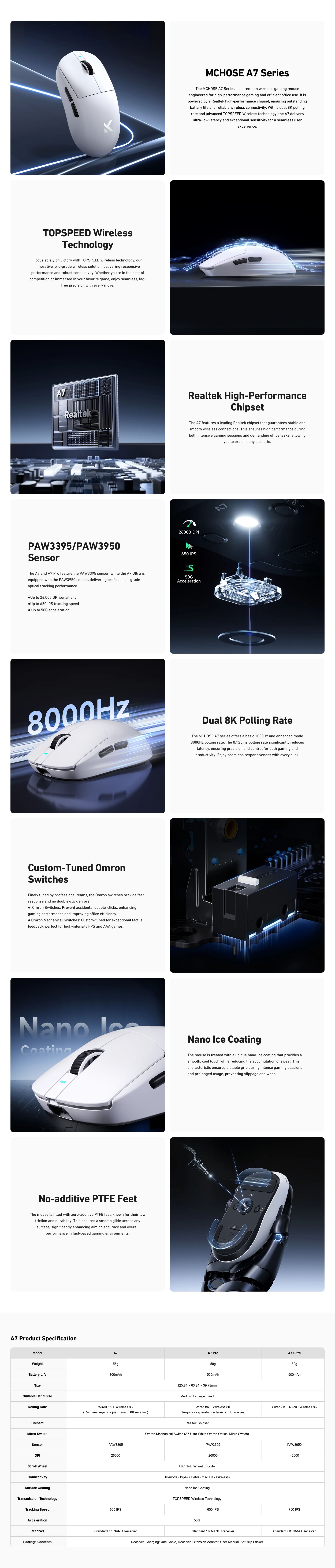 - MCHOSE A7 series: 1000Hz/8000Hz polling, 0.125ms latency.